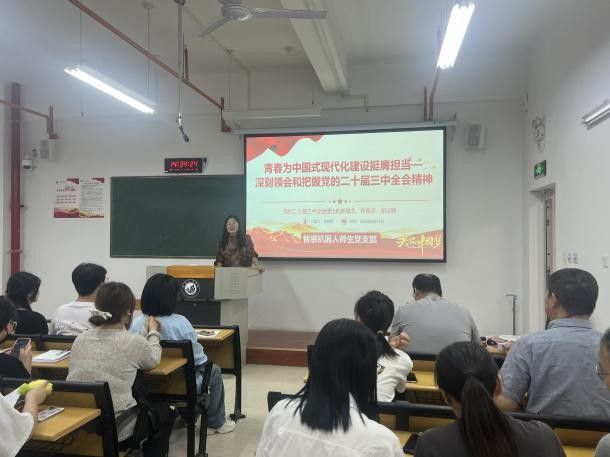 会上,支部书记张晓丽围绕《青春为中国式现代化建设挺膺担当——深刻领会和把握党的二十届三中全会精神》为题,详细阐述了进一步全面深化改革的主题、重大原则、重大举措、根本保证。组织委员张佳婧传达《习近平在全国教育大会上强调紧紧围绕立德树人根本任务 朝着建成教育强国战略目标扎实迈进》及《培养德智体美劳全面发展的社会主义建设者和接班人》等文件精神。从根本上着力加强对师生党员的思想引领,切实把思想和行动统一到全会精神上来,引导党员在学院高质量发展中贡献青春力量。