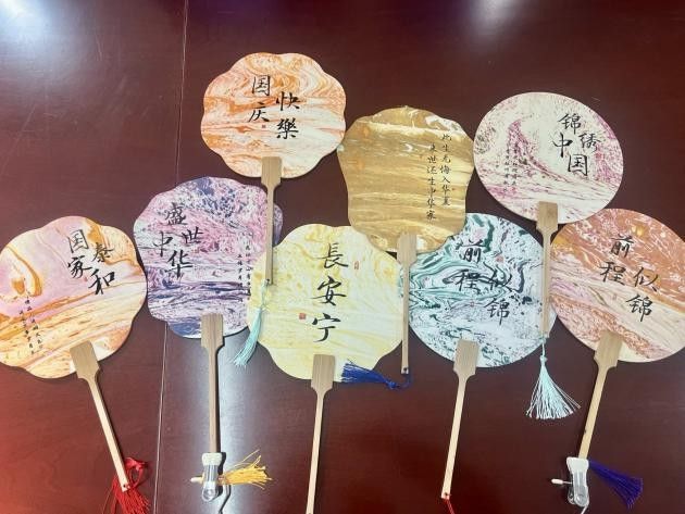 支部坚持学乐并行,以漆为笔,以水为画,绘漆扇传雅韵,献礼中华祝福祖国,漆扇赋予了传统文化以新的时代内涵和现代表达形式,学生党员王杨世豪给大家介绍了漆扇的历史、制作工艺、传承价值以及漆画的技巧。师生们渲染配色,以点、甩、弹、划等手法改变大漆纹路,持扇进入水中绘出图案,美轮美奂的国风漆扇《国庆快乐》《盛世中华》等作品就制作完成了,这些作品不仅展现了中华民族深厚的文化底蕴,更寄托了师生党员对祖国的无限热爱和美好祝愿。