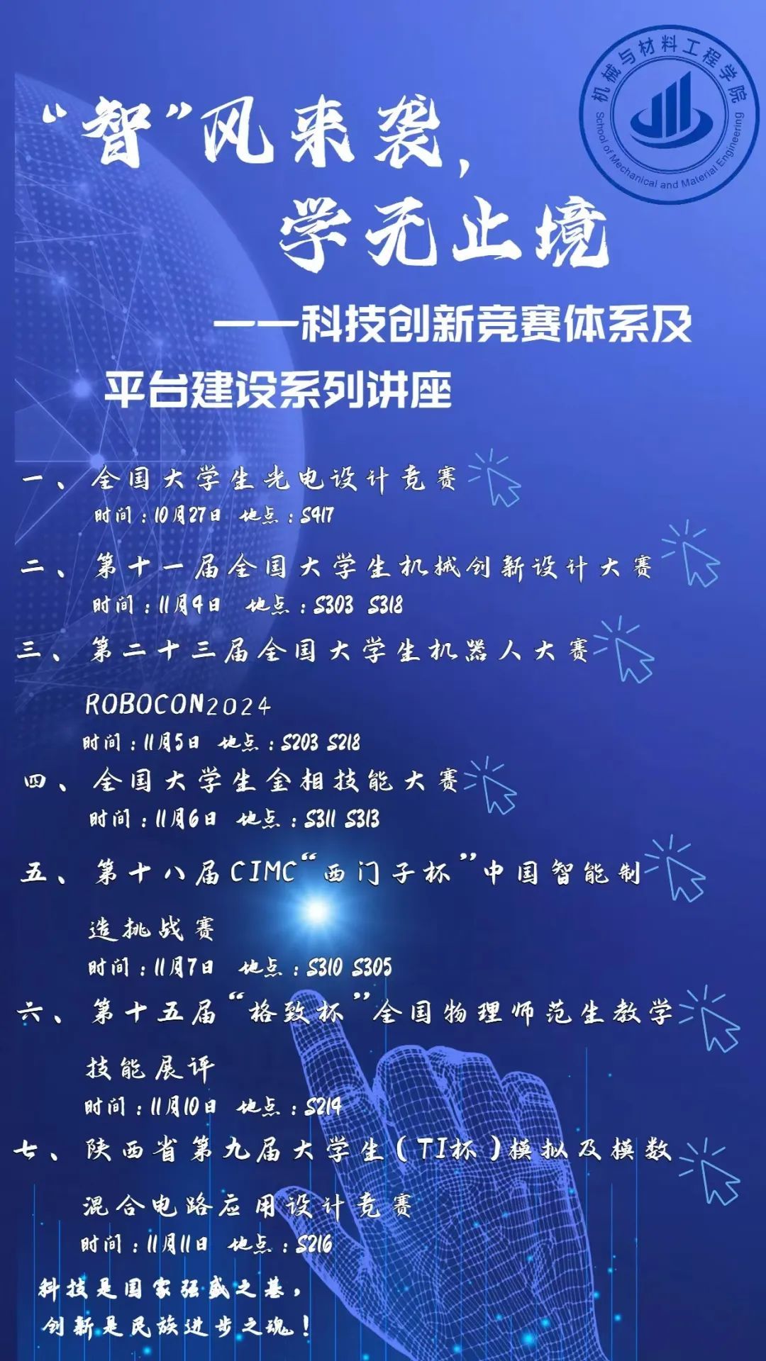 在这个充满机遇与挑战的时代,科技创新已成为推动社会进步的强大引擎。为了进一步激发大家的创新热情,提升科技创新能力,我院即将举办“智”风来袭,学无止境—科技创新竞赛体系及平台建设系列讲座活动。
