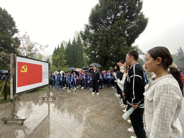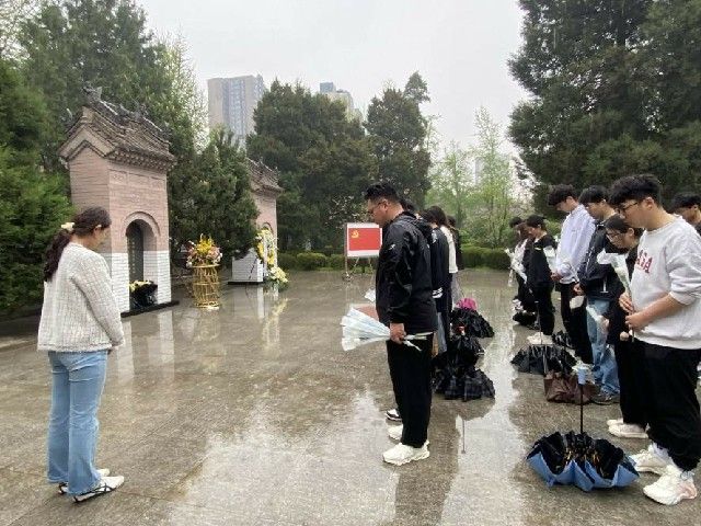 陵园内苍松劲柏郁郁葱葱,革命烈士纪念碑威严矗立,全体师生向烈士默哀致敬,深切缅怀革命先烈的丰功伟绩。随后,全体党员重温入党誓词,字字铿锵,告慰英灵。仪式结束后,同学们纷纷在烈士墓前献上白菊,擦拭雨水,寄托对革命先烈的哀思。