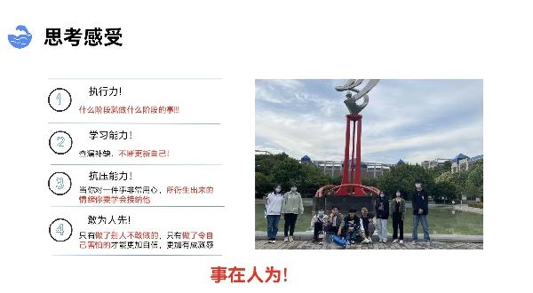 机器人1902班宋怡航以自己的参赛经历来向大家普及学科竞赛的重要性,鼓励大家在学习专业知识的同时多主动参与学科竞赛,丰富自己的学习生活。他表示,在任何时候,发展自己都是最好的选择,毕竟“事在人为”。