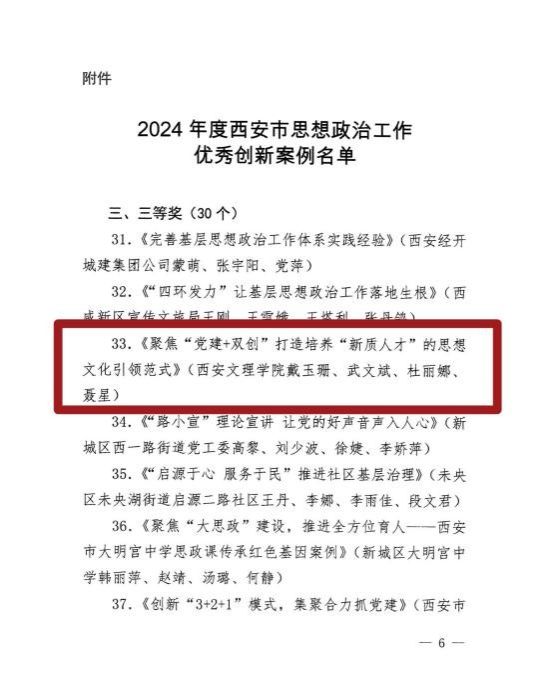 为深入贯彻落实习近平新时代中国特色社会主义思想和党的二十届三中全会精神,贯彻落实校党委关于思想政治工作的重要安排部署,机械与材料工程学院党总支认真总结凝练,并积极组织申报党建引领思政工作发展、一站式学生社区建设等学生思政工作创新案例。其中《聚焦“党建+双创”,打造“新质人才”的思想文化引领范式》获评2024年度全市思想政治工作优秀创新案例三等奖。