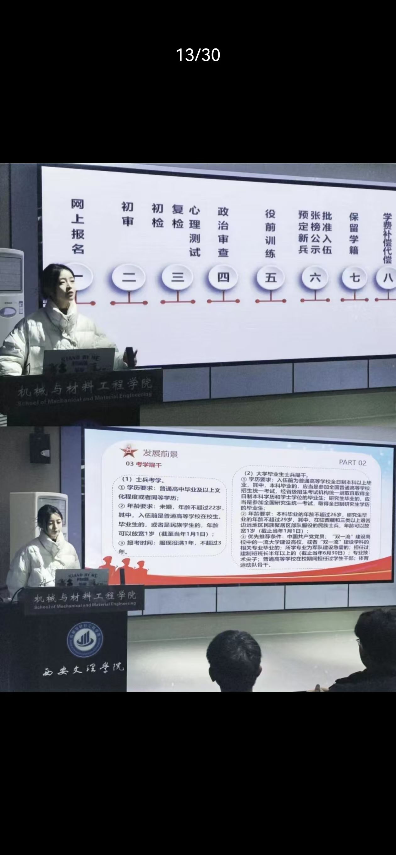 会议伊始,张佳婧对征兵条件、报名流程、征兵政策等方面进行了详细介绍。她讲解了征兵的基本条件,包括年龄要求、身体条件、政治审查标准等,让同学们对入伍的门槛有了清晰的认识。此外,介绍了大学生应征入伍在学业方面享有的优惠政策,如保留学籍、学费补偿代偿、退役后复学转专业等,强调了应征入伍对于个人发展的积极作用。通过列举实际案例,生动形象地展示了这些政策如何在现实中为大学生士兵提供支持和保障,使同学们切实感受到国家对大学生参军的重视与鼓励。